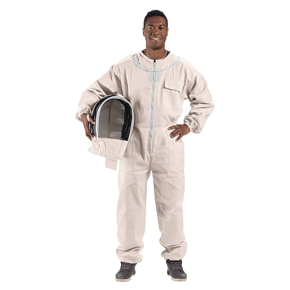 The features of the Polycotton Off White Beekeeping Suit With Adjustable Veil includes its professional level of protection, comfort, and all over beekeeping functionality. It is made of 100% natural, unbleached cotton as unbleached skin and provides unrestricted comfort while adequately protecting the wearer from stings. The self supporting fencing veil provides unrestricted face protection, excellent undesired visibility, and also has adjustable cuff and leg zippers for a more custom fit. The addition of reinforced knees along with various other pockets increases convenience making the suit easier to wear while also maintaining durability. Lightweight and breathable material of the suit provides optimal coolness, suiting the needs of beekeepers of all types.